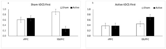 Interference effects for participants who received sham tDCS first (a) and for participants who received active tDCS first (b) for the two groups (rPPC, lDLPFC) as a function of stimulation (sham, active) for the 3-way interaction Group by Session Order by Stimulation. Error bars represent standard errors of the means.
