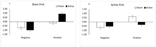 Facilitation effects (negative score indicates facilitation) for participants who received sham tDCS first (a) and for participants who received active tDCS first (b) for negative and positive target-words as a function of stimulation (sham, active) for the 3-way interaction Valence by Session Order by Stimulation. Error bars represent standard errors of the means.