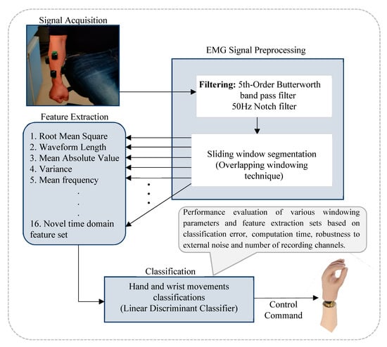 Re-integrating this category of persons into the society would require the development of a smart and intelligent rehabilitation robotic system [,,,]. Such intelligent robotic system normally incorporate less computational control algorithms that operate on symmetric principle and attract low memory and processor requirement, thus, aiding the realization of portable rehabilitation device that could be worn by amputees to help restore their arm functions [,,,]. Notably, such symmetrical principle play a significant role when it comes to the dynamics of controlling the prosthetic device during activities of daily living []. At the forefront of this technology is the pattern recognition based prostheses that seamlessly decode multiple patterns of targeted limb movements from measured bioelectrical data and provide multiple degrees of freedom arm function in an intuitive fashion [,,]. Typically, the pattern recognition strategy involves extraction of highly informative feature sets from the measured surface electromyogram (sEMG) data, which are applied to a machine learning model for limb movement intent decoding.