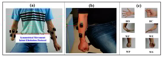 Haven determined the electrode configurations, the placement of the sensors was preceded by palpation of the remaining arm muscles in the amputee subjects to locate their belly and length as indicated in previous studies [,]. Afterwards, the sensors were placed over the skin area underlying the identified arm muscles in a symmetrical manner across both arms with the aid of adhesive (Figure 2a). That is, two out of the six sEMG sensors were placed on the extensor and flexor arm muscles while the remaining four sensors were positioned about 2–3 cm around the elbow crease as shown in Figure 2a,b. Notably, the symmetrical concept adopted in placing the electrode across both arms would enable the participant’s intact arm to guide the amputated arm in adequately eliciting their movement intent during the experiment, which would lead to the recording of EMG signals with high neural information for movement intent decoding (Figure 2a). Prior to the sensor placement, the sensor sites mapped out on the participants’ skin surface were thoroughly wiped using alcohol pads that takes off dry-dermis and skin-oil, which may affect the recorded signal’s quality. For participants with unduly dry skin, the skin cells were extricated via tapping of the site with medical tapes to guarantee good electrode-skin contact. After ensuring proper electrode placement and good experimental condition, the subjects were presented with an audio prompt to guide them in performing all the classes of targeted upper-limb movements in a sequential order that includes: wrist movements (wrist flexion/extension/pronation/supination), hand movements (hand close/open) as shown in Figure 2c.
