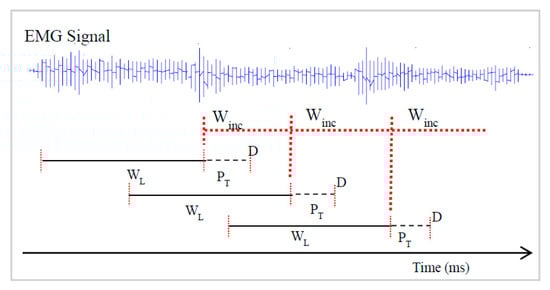 The EMG data segmentation is one of the important processes used to improve the performance and response time of EMG based pattern recognition control strategy and in this study, overlapping window technique introduced by [] was adopted to segment the EMG signal into different analysis window. This technique is associated with windowing parameters (length and window increment), where a part of the new analysis window data overlaps with the current window data, and all analysis windows increase with processing time as shown in Figure 3.