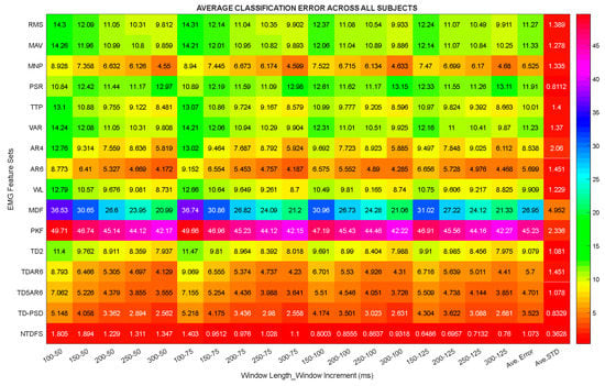In this section, the properties of the different extracted feature sets were studied in terms of their classification error (CE) across combinations of window lengths and increments (Table 1) for movement intent decoding based on the LDA algorithm. The obtained results across subjects and movement classes is presented using the Heatmap plot shown in Figure 4. This analysis shows the average CE across subjects (amputees and able-bodied subjects) and movement classes, where the columns represent the different extracted features and the rows denote the combinations of windowing parameters utilized in this study.