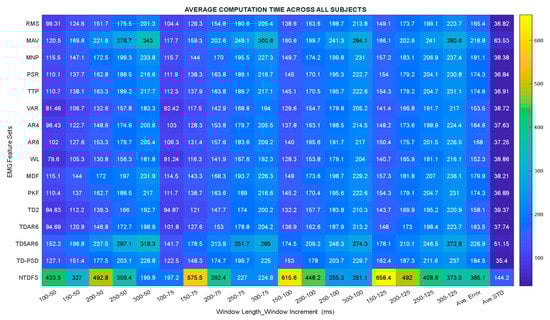 In this section, the characteristics of the feature sets were further studied based on their computation time (CT) across different combination of window lengths and increments, and the analysis was done based on sEMG data from both category of subjects, as shown in the Heatmap plot presented in Figure 5. The columns represent all the considered features extraction methods while the rows depicts the different combination of window lengths and window increments.