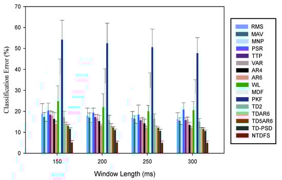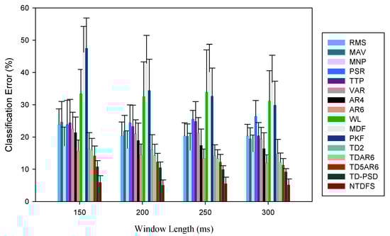 Furthermore, we investigated the performances of the feature sets in the presence of a disturbance, by introducing random noise into the EMG recording signal and the features’ performances were evaluated using the stability index metric across subjects and window lengths (150 ms–300 ms) as shown in Figure 6 and Figure 7. In this investigation, we found that the multi features, such as NTDFS, TD-PSD, and TD5AR6 recorded the least classification error, while PKF, MDF, and WL features recorded the highest classification error for both able-bodied and amputee subjects. Interestingly, this result further proves that multi features would be more robust to external interferences (noise) compared to the single features irrespective of the windowing parameters considered. Also, we observed that the effect of the introduced noise was much obvious on the sEMG recordings of the amputees compared to the able-bodied, which could be attributed to the fact that the residual arm muscles of the amputees may produce less-rich information than those of the able-bodied subjects in an ideal situation. Therefore, considering the fact that amputees are the end-users of the myoelectric device, there is need to employ a robust feature sets that will help to enhance classification performance of EMG-PR control system regardless of the windowing parameters adopted.