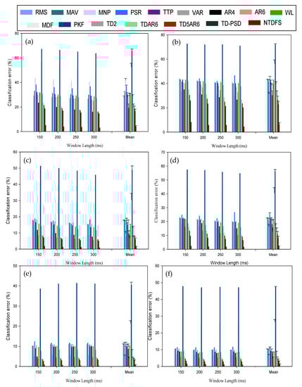 Mean classification error across varying window length at window increment of 100 ms for (a) 2-channel recording of able-bodied subjects; (b) 2-channel recording of amputee subjects (c) 4-channel recording of able-bodied subjects; (d) 4-channel recording of amputee subjects (e) 6-channel recording of able-bodied subjects (f) 6-channel recording of amputee subjects.