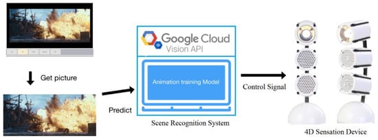 This study designed a four-dimensional (4D) audiovisual entertainment system called Sense. Some processing techniques were based on ideas from our previously published research []. This system comprises a scene recognition system and hardware modules that provide haptic sensations to users when they watch movies and animations at home. Figure 1 illustrates the system framework. First, we capture an image from a video and then input it into the scene recognition system to detect objects. For general videos, we used Google Cloud Vision to detect objects in the image; after the objects (e.g., fire, wind, or rain) had been detected, the 4D sensation device triggered a corresponding haptic sensation module (e.g., a heat lamp or fan). Because Google Cloud Vision cannot detect objects in animated videos, this study applied SSD to develop a system that can detect fire-related objects in animated videos. The proposed system can label fire-related objects in an animated video, enabling users to use Sense to obtain the corresponding haptic experience when watching the animated video. The following sections introduce the design methods of the 4D sensation device and the scene recognition subsystem of the proposed system.