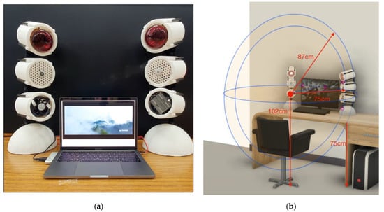 This study designed a desktop 4D sensation device that gives users a viewing experience similar to that of a 4D cinema when watching a video. Figure 2a presents the appearance of this device. The device allows users to receive haptic sensations of cold, heat, and vibration corresponding to the scene of the video they are watching at home. The red dot at the center of Figure 2b is the optimal experience point of this haptic device. To provide the most effective experience, after actual field trials, we took the head of the user in a sitting position as the center (default distance is 102 cm from the ground) and designed two ellipsoids with radii of 75 cm and 87 cm, respectively; the physical framework of the hardware device has been designed to conform to the radian of the ellipsoids. This design allows for each module to point to the center and superimpose various haptic sensations in the most efficient manner. For actual application, the designed concept of the 4D sensation device is portable, requires low power consumption, and is low cost. The length, width, and height of one single device are 20 cm, 20 cm, and 45 cm; and its weight is 2 Kg. This means that the user could easily set up and move this device. The electric power of one single device requires only 5 A current at 110 V, the user could use it as a home appliance. Besides, its construction cost is US $100.