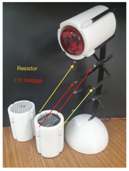 We used Fusion360 [] to design the external appearance of the device and used a 3D printer to produce the packaging. Additionally, for this system, we used an Arduino Pro Mini as the computing core for receiving computer signals, and the modules were run or stopped based on its control signals. As illustrated in Figure 3, each haptic module can be assembled freely in any position depending on the requirements of the user. Each module position has four DC power jacks of 2.1 mm, two of which are used to provide 110 V AC power. Unlike the operation of general power jacks, the inner tips of two power jacks provide power, and the sleeves of the power jacks protect users from electric shocks due to accidental contact; therefore, they do not provide any power. Furthermore, we placed the two power-providing power jacks diagonally opposite to each other. Such protective measures were intended to protect the device from being damaged by any short circuit that might occur if the module were installed incorrectly. We connected resistors of various values to the two remaining power jacks of each module, and in testing, the system was able to recognize the function of each module according to the resistance value.