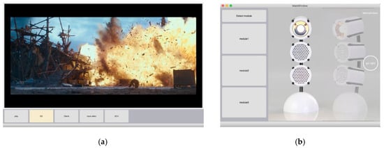 To use Sense for watching a video, we developed an operating software for this system, as illustrated in Figure 4a. In testing, first, the system read a 30 fps video, and then the system captured the images of the video every second. To use Sense for watching a video, first, the Sense operating system (Figure 4a) read a 30 fps video, and then the system captured images from the video in every second. If the video was a general live video, then these images underwent object detection according to Google Cloud Vision. Each captured image from live video was uploaded to the Google cloud server one by one for computation. The process spent 2–5 s for one image, depending on the network quality. For a one-minute live video, the system usually requires more than 2–5 min to record the detection results of those uploaded images. If the video was an animated video, then the animation scene recognition system trained with the SSD model conducted detection. The process spent 0.2 s for detecting fire-related objects in an animation image by using the MacBook Pro notebook. For a one-minute animation video, the Sense operating system requires only about 15–20 s to generate and record the detection result. When the user watches a general live video or an animation video, the corresponding record of the detection results is loaded in beginning. The 4D sensation device then allows users to receive haptic sensations according to these detection results. Subsequently, based on the detected objects, the system ran the corresponding haptic modules. Figure 4b depicts the control software of the 4D sensation device. Users were able to test the effect of each haptic module in this interface and adjust the operating time and intensity of each module according to their personal preferences. For example, they were able to adjust the operating time of the heat module or the intensity of the vibration module.