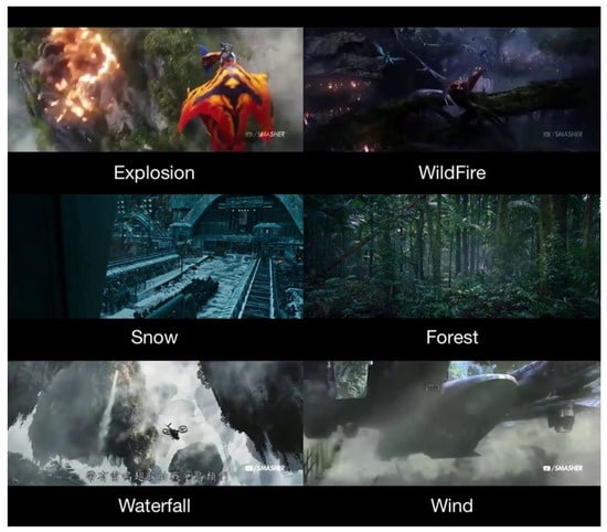 For general live videos, we used Google Cloud Vision on each captured image for object detection; for each detected object, the corresponding haptic module was run. A video of our system based on Google Could Vison is available at Reference []. We set up 35 types of objects in our study, some of which are listed in Table 2 along with the corresponding haptic modules. As displayed in Figure 5, the objects ‘wildfire’, ‘explosion’, ‘waterfall’, ‘snow’, ‘wind’, or ‘forest’ could be detected by Google Cloud Vision. If the scene recognition detected the object ‘explosion’ in an image, then the 4D haptic sensation device ran two heat modules, with the hot air module giving users an enhanced viewing experience. If the scene recognition system detected the object ‘snow’ in an image, then the 4D haptic sensation device ran the wet module and wind module. In this study, we added pine needle oil into the scent module; the users were able to smell the pine needle scent when the system detected ‘forest’ or ‘tree’ in a video. Because the vibration strength was determined by the sound volume in the video, the vibration module is not included in Table 2.