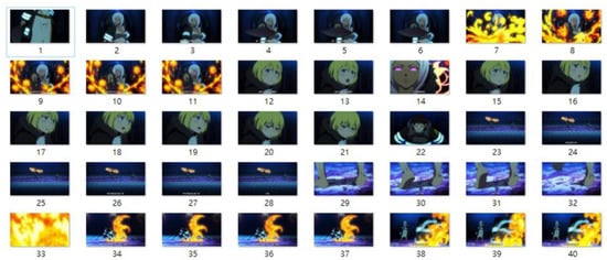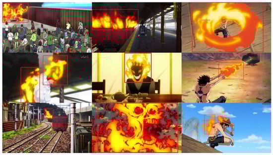 This study used the MXNet framework and the SSD deep learning algorithm to train an object detection system for animated videos. A video of our system based on the SSD deep learning algorithm is available at Reference []. We collected 1038 and 100 frames consisting of fire-related objects from animations as the training data set and testing data set of this study, respectively. Figure 6 displays some training data used in this study. Next, we manually marked these fire-related objects within the images with red boxes, as illustrated in Figure 6. Among these image data, we found that the colors of some fire objects in the animation were substantially different from the colors of fire in the real world. Some examples also show that the ways fires burn in animations are notably diverse (e.g., burning in concentric circles). Some stories may have irrational burning scenarios, such as a fire that burns only the face of the character but does not ignite or injure the rest of the body.