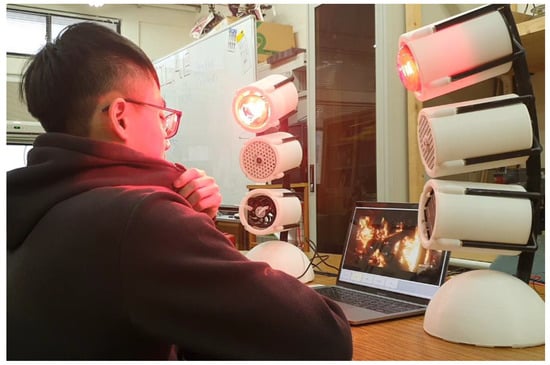 The research of Gonçalves et al. evaluated how multisensory stimuli (e.g., the use of wind, passive haptics, vibration, and scent) affect the senses of virtual reality (VR) users []. Their research indicated that the use of multisensory stimuli with VR and multimedia techniques creates new and engaging user experiences. Some researchers have presented VR applications that integrate multiple tactile sensations to enhance immersion experience through kinesthesia and cutaneous sensations. The studies of Han et al. presented two VR applications (called the SoEs (Sword of Elements) [] and BoEs (Bits of Elements) []) demonstrated the potential of using haptic feedback, specifically heat, air, vibration, and reaction force, for VR controllers. The VR application AoEs (Area of Elements) [] provided multiple tactile sensations to enhance the teleportation experience in two virtual environments. Inside a room-scale physical space, users can stay or walk through a portal between desert and snow scenes. Günther et al. presented a device called the Therminator that provides warm and cold on-body sensations in VR through heat conduction of flowing liquids with various temperatures []. Their experiment results indicated that thermal stimuli could override visual stimuli to control how the audience perceives temperature. Sasaki et al. proposed Virtual Super-Leaping to enhance the VR jumping experience []. Their haptic device was constructed with propeller units and a rod to generate various kinesthetic and airflow haptic sensations in midair.