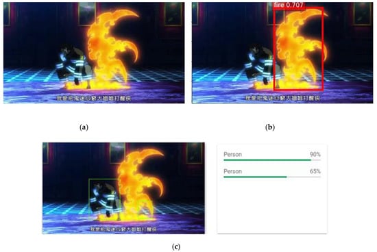 In this study, a 64-s animated video was used as the test video to compare Google Cloud Vision with the proposed SSD-based animation detection system. Sixty-four animation images were captured as test images from the animation video during each second. Twenty-five images consisted of the fire-like objects, and 39 images had no fire-like objects. Figure 9 presents some test animation images. This experiment examined whether two systems could accurately detect fire-like objects in the animation images. Figure 10 gives an example of a testing result. Figure 10a is the test animation image. Figure 10b shows that the proposed system could accurately detect the fire-like object. As can be seen from the testing result of Google Cloud Vision in Figure 10c, none of fire-like objects could be detected, but two ‘person’ objects were misdetected. In the experimental results of the entire animation images, both systems will not detect any fire-like object if the animation images did not really include any fire-like objects. However, for 25 animation images consisting of fire-like objects, Google Cloud Vision was unable to detect any fire-like objects, but the proposed SSD-based system was able to detect fire-like objects in most animation images (accuracy rate: 84%). These experiment results illustrate that our system provides a better user experience with animation than using Google Cloud Vision.