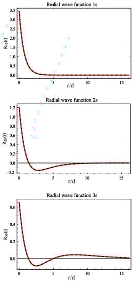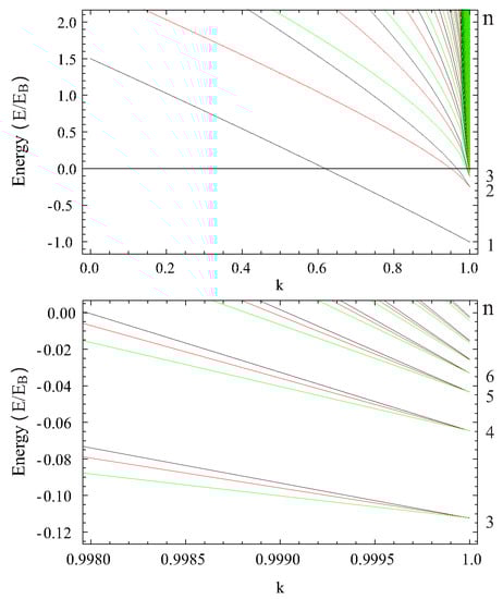 The diagonalization of the Hamiltonian matrices (75) and (79) lead to the correlation diagram displayed in Figure 1 as a function of . The parameter (74) turns out to be . Although the correlations diagram is the same for both methods, the corresponding basis dimension is different in order to reach convergence. As noticed, the levels corresponding to the principal quantum number in the Hydrogen atom converge to the well known degeneracy, although to simplify the figure we have only included angular momenta up to 2. The degeneracy corresponding to the projection should be assumed but not shown because of the -independence of the Hamiltonian. The states above the zero energy represent a discretization of the continuum. This kind of the description of the continuum is also present in the Morse and Pöeschl–Teller potentials [,,].