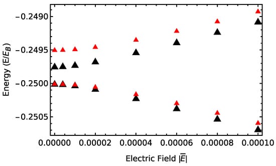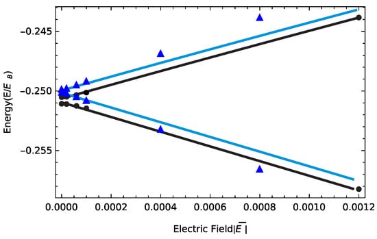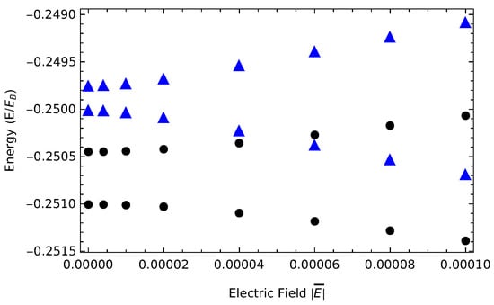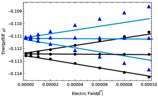 In Figure 4 the energy levels associated with the subspace as a function of the electrical field are depicted. In order to obtain these results, a cutoff of the dimension space determined by the feasibility of the calculations was necessary as well as a constraint in the involved angular momenta. The black solid circles correspond to the spectrum obtained using the -UGA, where the number of boson was taken to be up to L = 16, while the blue triangles correspond to HO-DVR method taking N = 3001 up to l = 11. The continuous lines correspond to the energy-splitting obtained by the variational approach described in Ref. [], where an accurate variational method is presented for the n = 2−5 shells for different including a display of the wave functions. Since, for each approach, the convergence of the energy levels for the null field is different the continuous lines were appropriately located to follow the splitting trend. There are two remarkable facts to be highlighted. First, the splitting is correctly described by the -UGA, while the HO-DVR method tends to overestimate the splitting as the field intensity increases. This behavior is explained by the different basis dimensions. As a second point, we notice that for small-field intensity the splitting is rather flattened, showing an evident deviation from the linearity predicted by perturbation theory. In order to clearly see this effect a zoom of Figure 4 is depicted in Figure 5 for low field intensities in the interval . Both approaches present this anomalous behavior, which we believe corresponds to a lack of convergence. To make clear that this is in fact the case, a similar plot is depicted in Figure 6 for the HO-DVR approach for different boson numbers. The black triangles correspond to , while the red ones to . From these plots, it becomes clear that as the basis dimension increases the splittings approach to the correct results.