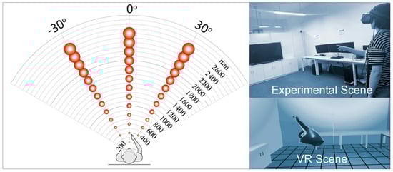 Three independent variables were included in this study. The first variable is the deviation azimuth of the horizontal FOV, which involved three levels of −30, 0 and 30 degrees. The 0-degree level was located at the mid-sagittal plane of participants and clockwise was adopted as the positive direction. The second independent variable was the size of the stimulus, with a FOV of 1.2, 2.9, and 7 degrees, respectively. The smallest stimulus is approximately equal to the width of the index finger pad exhibited by a man when he stretches his finger forward. The third independent variable is the distance between the stimulus and participants. In a range of 200 to 2600 mm, we examined 13 distances, with an interval of 200 mm. The experimental settings are shown in Figure 1. The setting of the experimental stimulus referred to the results of a pilot study.