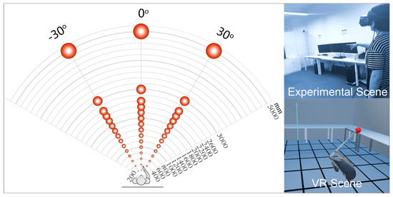 Three independent variables were included in experiment 2. The first variable was the deviation azimuth of the horizontal FOV, which included three levels, that is, −30, 0, and 30 degrees. The second independent variable was of different stimulus sizes, with a visual angle of 1.2, 2.9, and 7 degrees, respectively. The third independent variable was the distance between the stimulus and participants, involving 15 levels. Except for the 13 distances used in experiment 1, we additionally added two distances, including 3000 and 5000 mm. The experimental settings are shown in Figure 3.