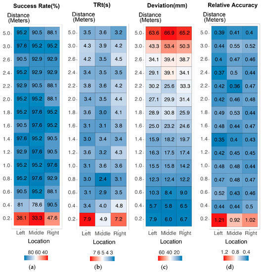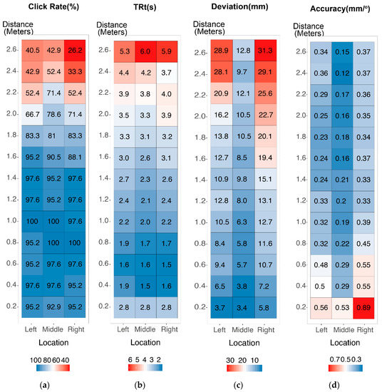 We analyzed the relationship between the position of the visual stimulus, including the horizontal azimuth angle of the stimulus and the distance between the stimulus and participants, and the performance of the finger clicking operation. The mean values of performance indexes are plotted in Figure 3, with the horizontal axis indicating the horizontal viewing angle (−30, 0, and 30 degrees) and the vertical axis representing the distance between the stimulus and participants (0.2–2.6 m). Figure 4a–d visualizes the mean success rate of clicking, TRt, operational deviation, and relative accuracy at different spatial positions, respectively. The TRt, operational deviation, and relative clicking accuracy in the situation where clicking was not completed successfully were excluded.