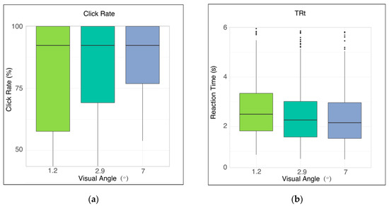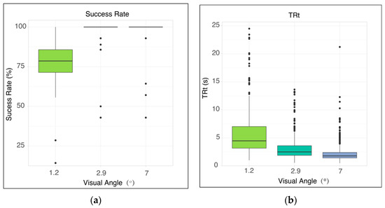 An F-test and t-test were performed for investigating the task performance using the stimulus of different angles of view (i.e., different visual sizes), and the results are plotted in Figure 5. No significant result was found in terms of the success rate, where F (2114) = 1.265 and p = 0.286 > 0.05, as shown in Figure 5a. Whether participants had a willingness to click was primarily determined by the distance between them and the stimulus. Regarding the comparison among clicking deviation values, significant differences were found among different stimulus sizes, where F (2114) = 29.486 and p = 0.000 < 0.01. Furthermore, significant differences were also found for TRt data, where F (2114) = 4.655 and p = 0.011 < 0.05, as displayed in Figure 5b. The results of the t-test indicated that the TRt data of 1.2 and 2.9 degrees were significantly different, where t (76) = 2.145 and p = 0.035 < 0.05; TRt data of 1.2 and 7 degrees were also significantly different, where t (76) = 2.788 and p = 0.007 < 0.01. However, no significant difference was found between 2.9 and 7 degrees, where t (76) = 0.686 and p = 0.495 > 0.05. It can be seen that when the stimulus size increased within the size range providing an angle of view of over 2.9 degrees, there was no significant change in TRt.
