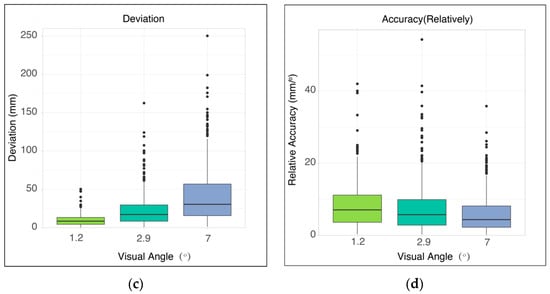 Significant differences were found among operational deviation values using different stimulus sizes, where F (2114) = 29.486 and p = 0.000 < 0.01, as shown in Figure 5c. Additionally, the results of the relative accuracy were also found to be significant, where F (2114) = 9.722 and p = 0.000 < 0.01, as plotted in Figure 5d. The t-test showed that the relative accuracy data using stimulus sizes of 1.2 and 2.9 degrees were significantly different, where t (76) = 2.807 and p = 0.006 < 0.01; the accuracies using stimulus sizes of 1.2 and 7 degrees were also significantly different, where t (76) = 3.864 and p = 0.000 < 0.01. In comparison, no significant result was found when using stimulus sizes of 2.9 and 7 degrees, where t (76) = 1.452 and p = 0.151 > 0.05. Overall, it can be observed that the clicking accuracy was closely associated with the stimulus size, although no marked change in the accuracy was found when the stimulus size was larger than 2.9 degrees.