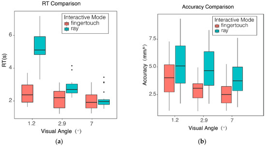 Performance comparison of finger clicking and finger ray-casting techniques. (a) RT comparison of the two interactive mode with three stimulus sizes; (b) Accuracy comparison of the two interactive mode with three stimulus sizes.