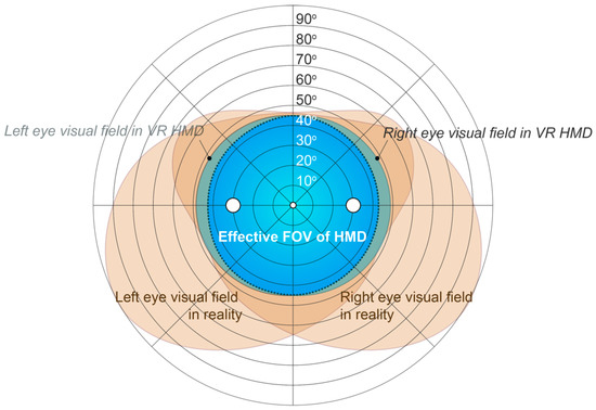 The human FOV is about 200 degrees horizontally and 130 degrees vertically [50]. Since HTC Vive Pro provides a FOV of approximately 110 degrees (the FOV parameters of other mainstream HMDs are similar), and the embedded sponge pads may increase the distance between eyes and lenses, the actual FOV of a single eye that we measured by the kinetic perimetry paradigm is about 92 degrees (temporal 49 degrees and nasal 43 degrees). Figure 9 shows the binocular FOV in HMD represented by polar coordinates. The monocular visual field is physically restricted within a circular when wearing HTC Vive Pro and the maximum binocular visual field is the blue-colored range presented in Figure 9. Therefore, the visual content in virtual information should also be placed within this visual range. In addition, as can be concluded from the aforementioned performance analysis, the finger clicking interaction is sensitive to the special position of the stimulus, so the size of an interactive object situated far from the center visual field should be increased when adopting finger clicking techniques, while it is less critical to the ray-based interaction. Therefore, when designing the interaction within a near-field (within 1.8 m), interactive controls and elements in the surrounding area should be set larger to ensure the efficient operation of various programs in HMD based on the direct finger contact interaction. Drasdo has proposed that the marginal elements are visually smaller than the central display elements, which decrease according to the function of cos2(θ), where θ is the angle of eccentricity [51]. However, using HMD in real-life conditions is often accompanied by head movement and eye movement, so the change amplitude of targets is much smaller than what occurs when using a fixed viewpoint. Based on the results of the current research, we could conclude that the target 30 degrees that deviated from the center visual field should be enlarged by 2.4 times in size, which could serve as a design reference for considering the enlargement ratio of visual elements in future work.