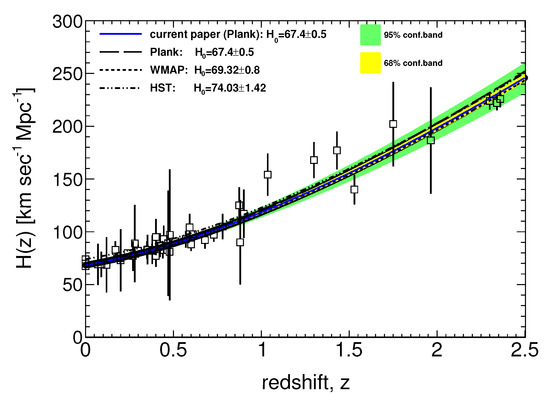 In Figure 1, the black lines (dashed, short-dashed, double dotted-dashed) represent the Hubble diagrams for the ΛCDM model fits with the fixed parameter with respect to the recent reports of the experimental collaborations, namely Plank [39], WMAP [58] and HST [42], while and were released. The square data points with error bars are all taken from [52,53,54,55,56]. The colored line (solid blue) display our model using the determined from the Plank report [39]. The light yellow and green bands show its 1 and 2 confidence levels, respectively.