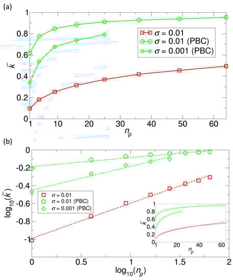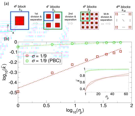 In this way, we can repeat the division-separation procedure under the similarity symmetry, the competition is continuously reduced, and as a result, the overall rate constant increases. Moreover, with the assumption that  is constant, after an M-fold symmetric division and arrangement, we finally obtain the overall rate constant . That is, we obtain the power–law relationship between the rate constant  and the number of division-separation procedures . Subsequently, we obtain the normalized rate constant , which is calculated by dividing  by the rate constant for  ( or ), and the same power law , where . However, note that this power–law scaling behavior has limitations. That is, we consider only the nearest neighbor competitions through the similarity symmetry, but if we take into account the competitions arising from all possible pairs of patches, the behavior of the rate constant will deviate from the power–law behavior as M or  increases. Moreover, since the upper value of  is 1 (normalized rate constant for ), we expect that as the number of procedures M increases,  will eventually become saturated, which means that  decreases; otherwise  diverges as M increases.