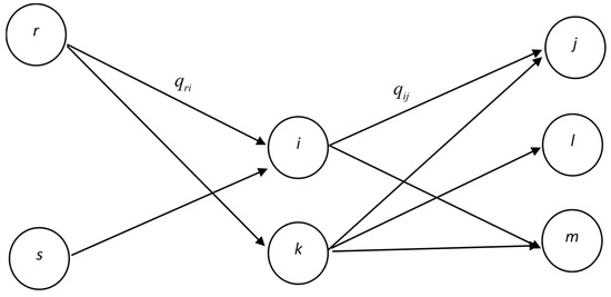 Assume that a network structure is depicted as shown in Figure 2, where the circles denote different vertices, and values qri denote the flows from vertex r to vertex i. We consider the centrality of a vertex in terms of two factors, namely, the amounts of inflow and outflow. In addition, we also define the reference of vertex i, R, as the vertex which link to vertex i (e.g., vertices r and s). For example, in the path from r to i, denoted by r → i, vertex r is the reference of vertex i.