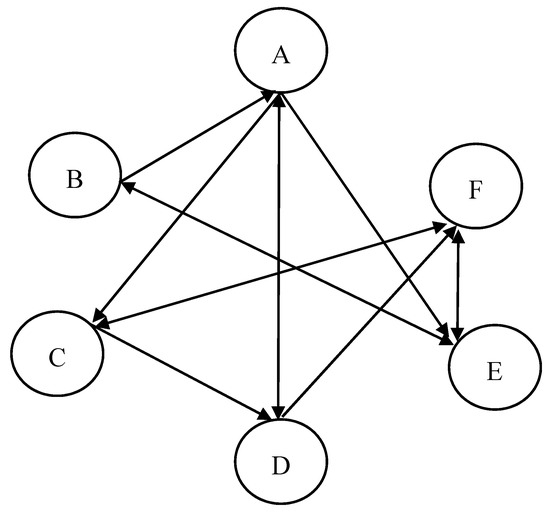 where we reflect the influence of the feedback flows in the inflow and outflow matrices. We use the following example to demonstrate the indices defined here. This example has six vertices that contain directed and feedback links between vertices, as shown in Figure 3.
