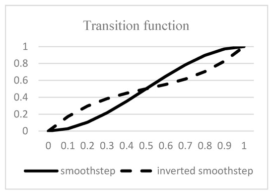 Sigmoid functions, e.g., logistic or hyperbolic-tangent functions, are widely used in many methods, e.g., neural networks and fuzzy cognitive maps, to squash values into a specific range. For example, the logistic function can squash any real number into (0, 1) and the hyperbolic-tangent function can squash a real number into (−1, 1). Sigmoid functions are popular because they can reflect situations of the real world. However, conventional sigmoid functions are not suitable here, since the centrality of a vertex is always positive and falls into the range of [0, 1] instead of a real number. Note that M(vi(t + 1)) in Equation (22) satisfies M(vi(t + 1)) ∈ (0, 1) and . Hence, in this paper, we introduce two sigmoid functions, namely, the smoothstep and inverted smoothstep functions, to reflect the s-shape situation of updated centralities and restrict the input range between [0, 1], as shown in Figure 4.