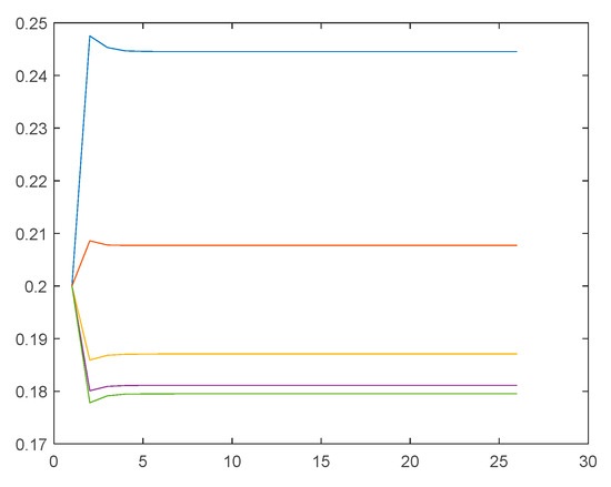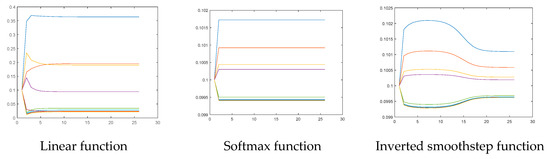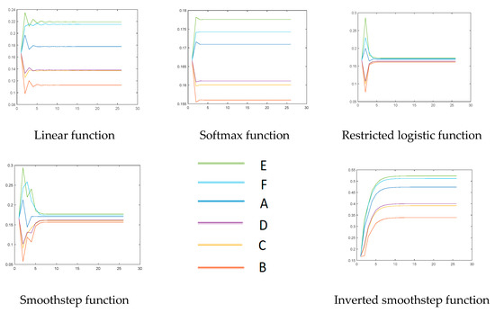 Next, we can examine the transition functions to understand the convergence and influence on the centralities and ranking of vertices. First, the centralities of the vertices in each iteration are normalized to the sum of them as one. Then, we can depict the iterative processes of all transition functions here with , as shown in Figure 5.