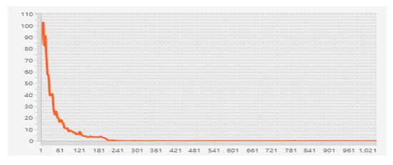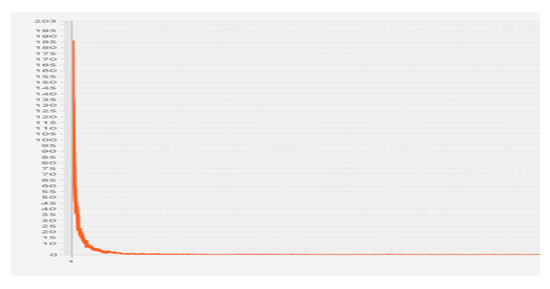 The social network indicates several main subgroups and only one connected component can be identified. Next, we can depict the degree distribution of the graph to see if the graph satisfies the power law principle, as shown in Figure 10. The graph shows a slight shape of the power law principle to justify the dataset, and as such can be viewed as a small-world network.