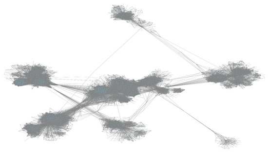 The Facebook dataset demonstrated here was provided by Sharma in Kaggle (https://www.kaggle.com/sheenabatra/facebook-data). The graph contains 4039 nodes and 88,234 edges with an average degree of 43.6910. The task here is to find the top 10 key persons within the social network by the proposed algorithm and compare the results with other conventional algorithms. First, we can depict the social network as shown in Figure 9.