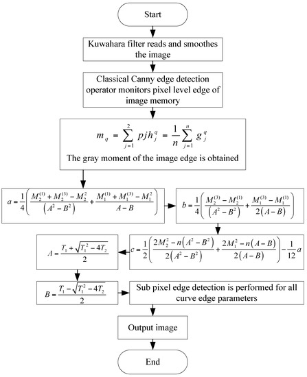 Smart edge detection operator is a basic edge detection operator, which can ensure that the real edge loss is less in image detection, and non-edge detection is unlikely to be edge. The detection steps of the Canny operator are as follows. First, the image is processed by Gaussian filtering to remove harmful noise [16]. Then, the gradient amplitude and gradient direction of the image are calculated, and the image edge is thinned using “non-maximum suppression” technology. The threshold technology is used for further processing, and the double threshold iterative method is used to extract the real edge. Assuming the Canny operator uses double threshold method to detect the strong edge and weak edge of the image. When the strong edge and the weak edge are connected together, the weak edge can be retained. This method can effectively reduce the error rate of edge detection and realize the real extraction of strong edge and weak edge. Sub-pixel edge detection technology is a high-precision edge detection algorithm, which is based on the pixel edge. Usually, the traditional edge detection algorithm firstly detects the edge of the image at pixel level. Then, the edge position detected by this method is expanded outward, and the sub-pixel detection method is used to find more accurate edge position [17]. This paper mainly uses the moment-based sub-pixel edge detection method, which is insensitive to noise and uses the moment integral operator to locate the sub-pixel edge.