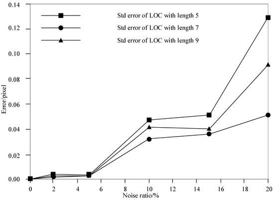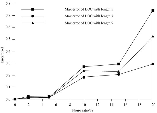 Under different region lengths, the detection results of sub-pixel edge detection methods in this paper are different. Observing the maximum error results of edge position under different region lengths in Figure 2, it can be found that when the edge length is 7, the detection effect of the maximum error of pixel under different noise ratios is the best. Observing the average error results of edge position under different area lengths in Figure 3, we can see that when the edge length is 7, the detection effect of the average error of pixels under different noise ratios is the best, the detection effect is the second when the edge length is 9, and the worst when the edge length is 5. Observing the standard deviation results of edge position under different region lengths in Figure 4, it can be found that the pixel error standard deviation detection results are the best when the region length is 7, and it is the worst when the region length is 5.