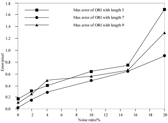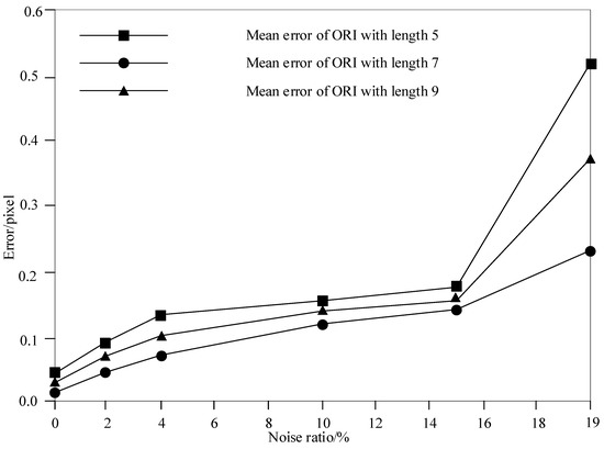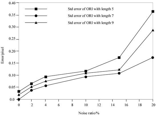 Observe the edge direction detection results of different area lengths, as shown in Figure 5, which is the maximum error result of edge direction under different area lengths, and we can infer that the best detection effect of the region length is 7, the second one of the region length is 9, and the worst is the region length that is 5. As shown in Figure 6, it is the average error result of edge direction under different area length. Similarly, when the region length is 7, the detection effect of the pixel average error is the best under different noise ratio, and when the region length is 9, the pixel average error detection effect is the second, and when the length is 5, the effect is the worst [21]. As shown in Figure 7, it is the standard deviation result of edge direction under different region length. When the edge length is 7, the standard deviation value of pixel error under different noise ratio is the smallest, and the detection effect is the best. When the edge length is 9, the detection effect is the second, and when the edge length is 5, the effect is the worst.