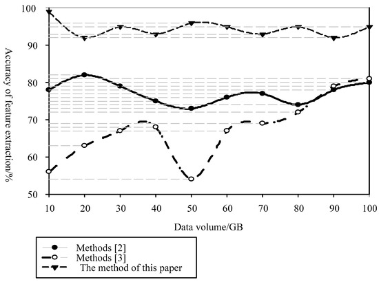 Analysis of Figure 8 shows that, when the amount of data is 10GB, the feature detection accuracy of the method in reference [2] is 78%, that of the method in reference [3] is 56%, and that of the method in this paper is 99%. When the amount of data is 80GB, the feature detection accuracy of reference [2] method is 74%, that of reference [3] method is 72%, and that of this method is 95%. The feature detection accuracy of this method is much higher than that of other methods, indicating that the accuracy of this method is higher.