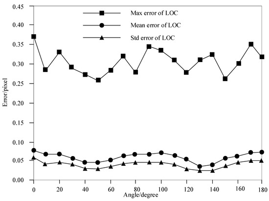 From the above data, we can know that the algorithm in this paper has better position and direction detection effect in different angles of lines. Therefore, the error for the detection result of the method in this paper under the change of angle is further represented by lines, as shown in Figure 9 and Figure 10.