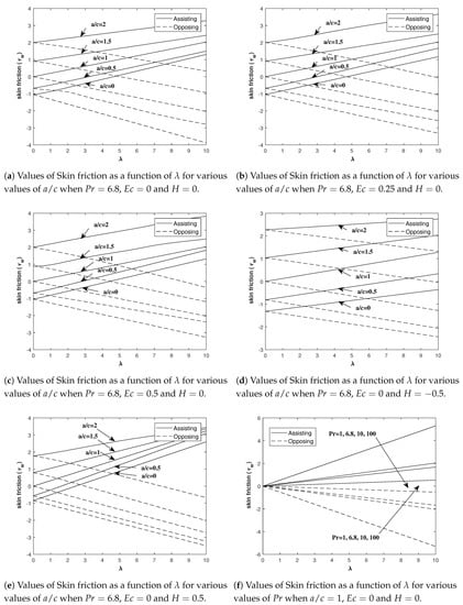 Figure 2a–e. From these figures, it can be easily understood that the buoyancy assisting flows increase the skin friction values while the buoyancy opposing flows decrease the skin friction values. This physical phenomenon occurs when there is a increase in the buoyancy force, the velocity of the fluid increases. Simultaneously, when the velocity of the fluid increases, the values of skin friction also increase. Further, for small suction/injection and viscous dissipation parameters, the skin friction values increase rapidly for assisting flows and it decreases for opposing flows. Therefore, the assisting and opposing flows are in the opposite directions for the small values of viscous dissipation, suction and injection. In the analysis of Ishak et al. [