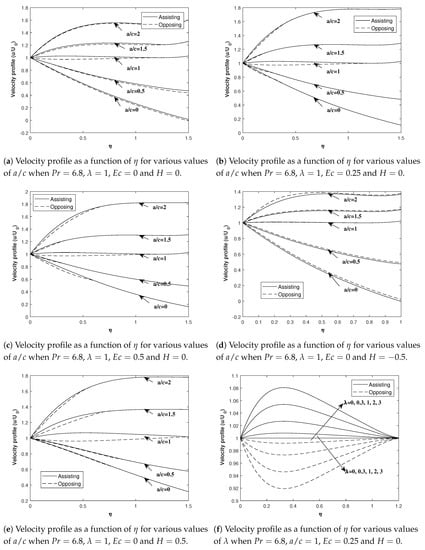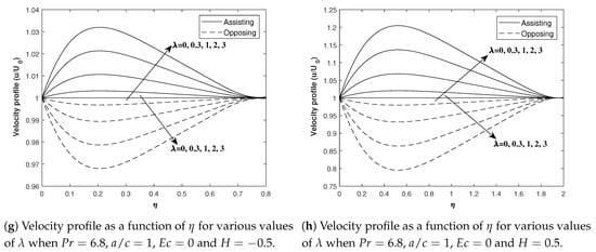 Figure 4f–h, during the effects of suction/injection, it is inferred that, for assisting flows, the velocity increases suddenly from the value 1 at the beginning and it reaches a particular maximum value then it decreases gradually until the value becomes 1. The velocity profile attains its maximum value when the value of