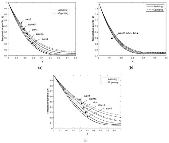 Figure 5b,c, one can notice that, during suction, the boundary layer thickness is very thin when compared with the thickness of the thermal boundary layer during injection. Hence, heat flows from the stretching sheet to free stream temperature for assisting and opposing flows during suction and injection.