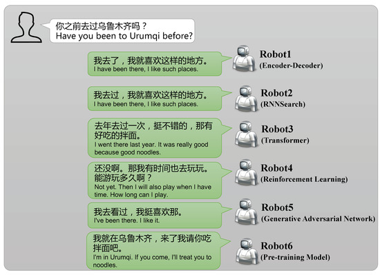 Text generation is a core task in artificial intelligence and natural language processing, which is essential for many popular downstream applications, such as the chitchat style dialogue system for human–machine conversations. Compared with traditional statistical machine learning methods [1,2], the methods based on deep neural networks (DNNs) [3,4,5] have achieved superior performance because they can effectively leverage massive data to capture high-level feature representations and automatically learn strategies for response generations while requiring minimum supervision. A variety of deep learning architectures, such as Seq2Seq, RNNSearch, transformer, generative adversarial nets, reinforcement learning, and pre-trained language models, have been utilized to achieve the state-of-the-art response generation performances on different datasets.