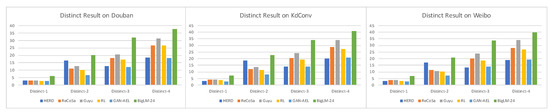 Table 2, Table 3 and Table 4 and Figure 2 and Figure 3 describe the detailed evaluation results for all the models on the KdConv, Weibo, and Douban datasets, separately.