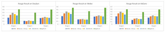 • As shown in Table 2, on the KdConv dataset, according to the BLEU and perplexity, the performance prioritizes for pre-training model-based models, transformer-based models, RNNSearch-based models, RL-based models, Seq2Seq-based models, and GAN-based models. As given in Table 3, but on the Weibo dataset, from the results, we can observe that the performances of RL-based models are better than those of RNNSearch-based models. The performances of GAN-based models were better than those of the Seq2Seq-based models. As given in Table 4, on the Douban dataset, according to the performances of those six architectures, the performances are ranked as pre-training model-based models, transformer-based models, RNNSearch-based models, RL-based models, Seq2Seq-based models, and GAN-based models. Among them, Seq2Seq-based models and GAN-based models performed similarly.