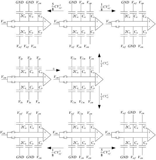 This design adopts the strategy by using the bottom plates of the capacitor array sampling the input signal to get better linearity. Bottom plate switches changing from common-voltage Vcm to reference voltage Vref or physical ground GND in every bit of conversion. Moreover, the most significant bit (MSB) can determine without any switching energy consumption; Vcm based tri-level switching method example, as shown in Figure 2 with 3 bits conversion. The stepping size is directly proportional to the capacitor array’s sizing during the binary search with this method. The input signal compares with (±2/4) Vref according to the first comparison, switch turning up or down, connect with the reference voltage Vref or physical ground GND in the DAC. For 12-bit SAR ADC, Vcm based tri-level switch structure produces switching energy consumption of 681.83 CV2ref, saving 87.51% of changing energy consumption than the traditional DAC switch structure.