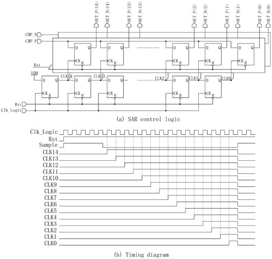 The SAR control logic circuit is necessary to control the tri-level switches and digital codes output. At the beginning of conversion, sample and hold circuits sample the input signal, and all Flip-Flops are reset by the global reset signal at the same time. When the clock’s rising edge is coming, the Flip-Flops load the results from the comparator. MSB output isone or zero depending on the MSB switch control signal of the control logic to the DAC. Then the shift register ring counter shifts one when a bit has been decided until least significant bit (LSB). This type of shift register ring counter designed M+4 clock cycles to convert each sample, four clock cycles sampling sufficiently and steadily, and ensure the sampling bandwidth is larger than the Nyquist frequency. M clock cycles determine the MSB to LSB successively, including redundant code. This architecture keeps many advantages: Firstly, it is low power consumption based on Vcm architecture with a tri-level switching method; Besides, since the shift register ring counter and SAR control logic is iterative, it is easily extended to higher resolutions by just extending the shift registers, using this similar method, assign different clock period to an individual bit decision step is possibly and easily. Figure 3 shows the schematic of the SAR control logic and its timing diagram. CLK14 to CLK0 load the digital output codes from the comparator to the output register. After that, the digital output code feedback as control signals for the tri-level switches of lower capacitor array to accomplish the switching procedure. The digital calibration circuit performs 15b redundancy code to 12 b digital output code conversion simultaneously.
