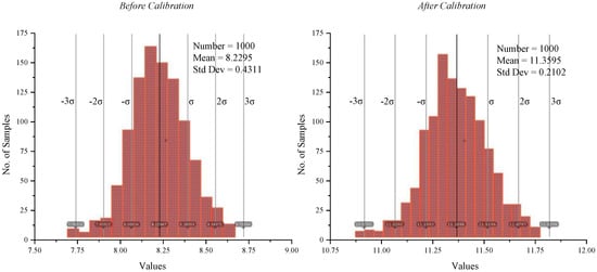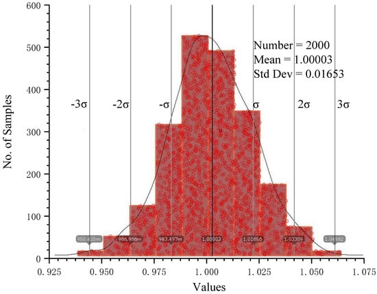 This design considers the impacts of the parasitic capacitance on the top and bottom plates of the capacitor array, the channel capacitance of the MOS switch, and the parasitic capacitance on the comparator input gate in the case of non-ideal layout and wiring. The parasitic capacitance on the top plate of the capacitor array will cause the amplitude attenuation of the input signal, which will reduce the effective power of the input signal. This design adopts a bottom plate sampling strategy to improve the linearity. The parasitic capacitance of the bottom plate on the capacitor array will seriously affect the input signal’s linearity. This paper presents a digital background calibration technique based on capacitance array redundancy, reducing the voltage difference caused by parasitic capacitance and capacitor mismatch, thus improving the ADC’s performance. The calibration algorithm ensures to reduce or even eliminate the maximum voltage error caused by capacitor array mismatch. Figure 4 shows the histogram of the Metal-Oxide-Metal (MOM) unit capacitor mismatch in 2000 times Monte Carlo simulations.