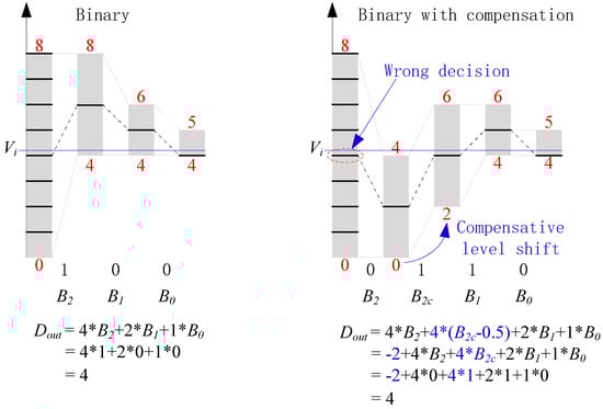 A unit capacitor CRd (CRd = Cu) adds to the capacitor arrays for signal sampling completeness. The unit capacitor CRd participates in the sampling process and does not participate in the quantization process. The total number of unit capacitors of the full differential N-bit charge redistribution SAR ADC is 2N*Cu; Figure 1 depicts the structure of binary-weighted error compensation SAR ADC where it inserts three compensative capacitors array C2C, C5C, and C8C, and the weight equal with C2, C5, and C8, respectively. The digital error correction logic circuit is generated by the design compiler to execute the error compensation. The DAC switching method saves a large proportion of switching energy and half of the capacitors than the conventional structure. When the ADC system starts to work, the two capacitor arrays’ bottom plates start sampling the input signal. Then, the full differential dynamic comparator starts the first comparison.