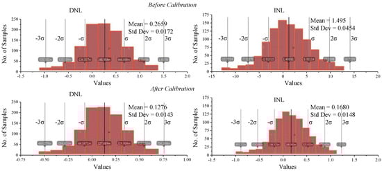 The differential nonlinearity and integral nonlinearity with 1000 times Monte Carlo simulations before and after calibration, respectively, as shown in Figure 8. The simulation results show that the digital background calibration algorithm improves the static performance significantly.